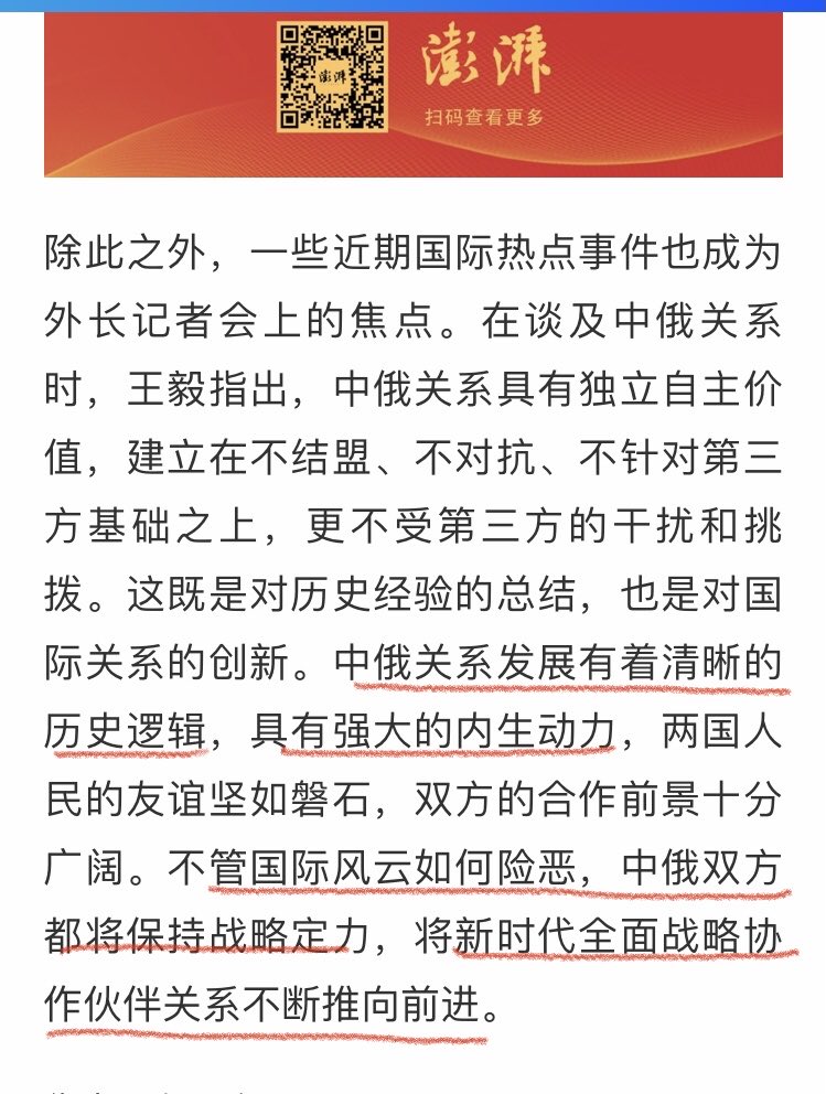 尽管普京对乌克兰发动举世震惊的侵略战争,中国仍将俄国列为最重要战略伙伴,称与莫斯科的关系是世界上最重要的双边关系。王毅今天在人大新闻会上再次强调”中俄两国人民友谊牢不可破.”
