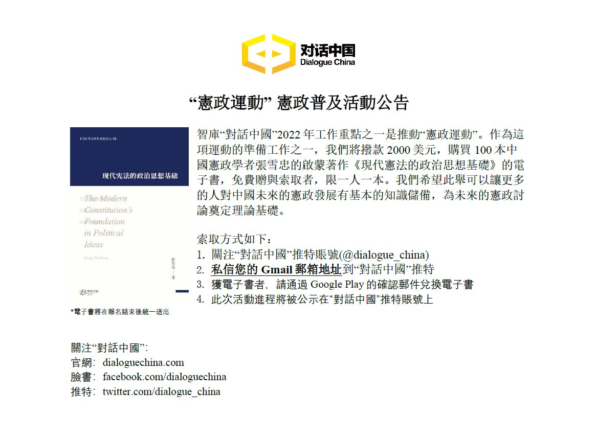 推動憲政運動,「對話中國」智庫免費贈書活動: