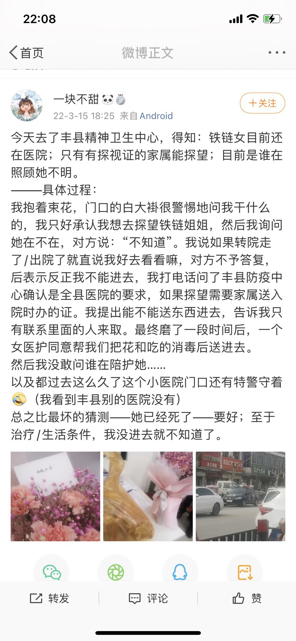 乌衣为救锁链女而遭丰县自称警察的一伙人拘押、搜身、审讯。这是乌衣2月21日发布的她在丰县与警察斗智斗勇的过程。请耐心读完七个截图文字。后来,乌衣就“失踪”了,至今生死不明。关注锁链女的同时,让我们都来关注乌衣,大声呼吁:寻找乌衣!乌衣在哪里?