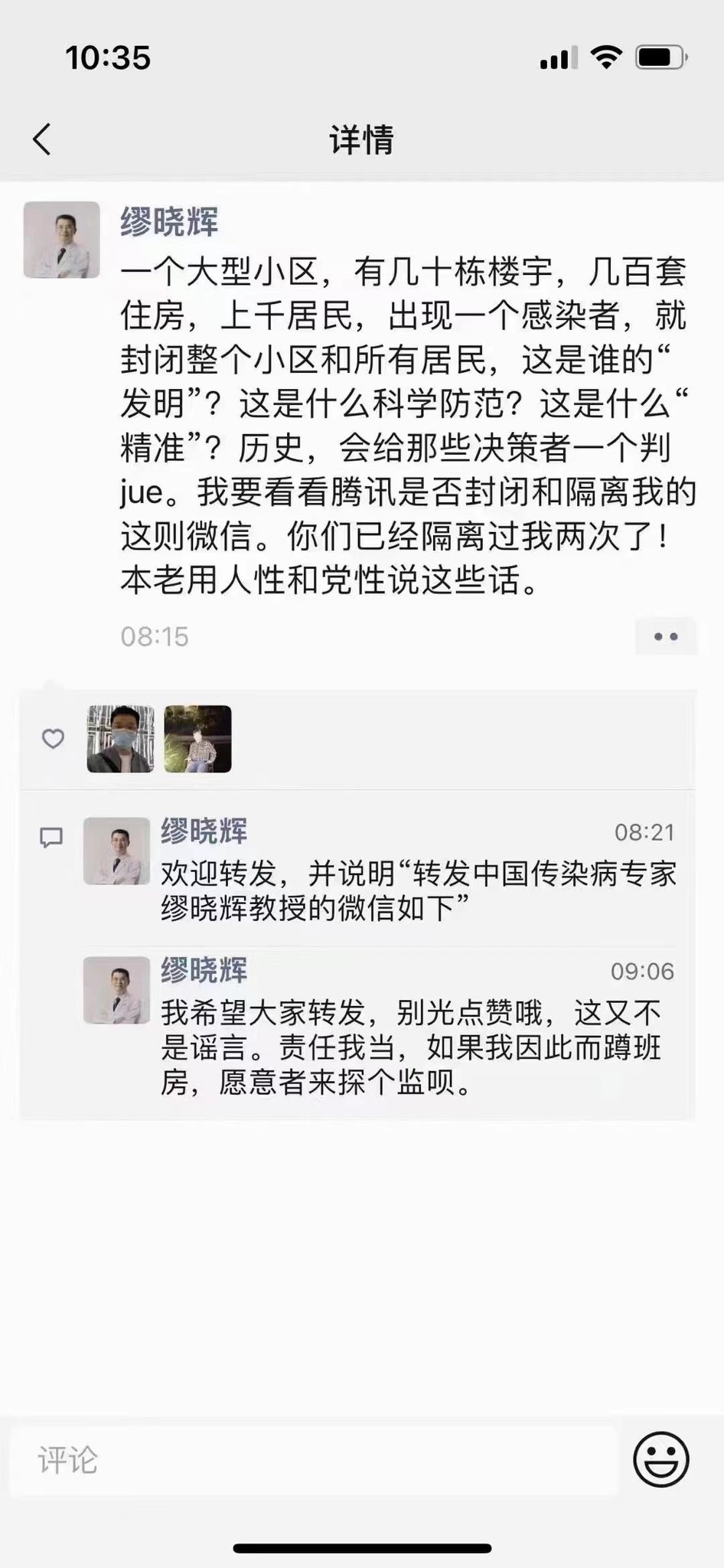 浦志强: 我赞成缪晓晖教授的观点。我认为现在痴迷清零的疫情防控政策,是非理性的和无意义的。故发中国传染病专家缪晓晖教授的微信如下: