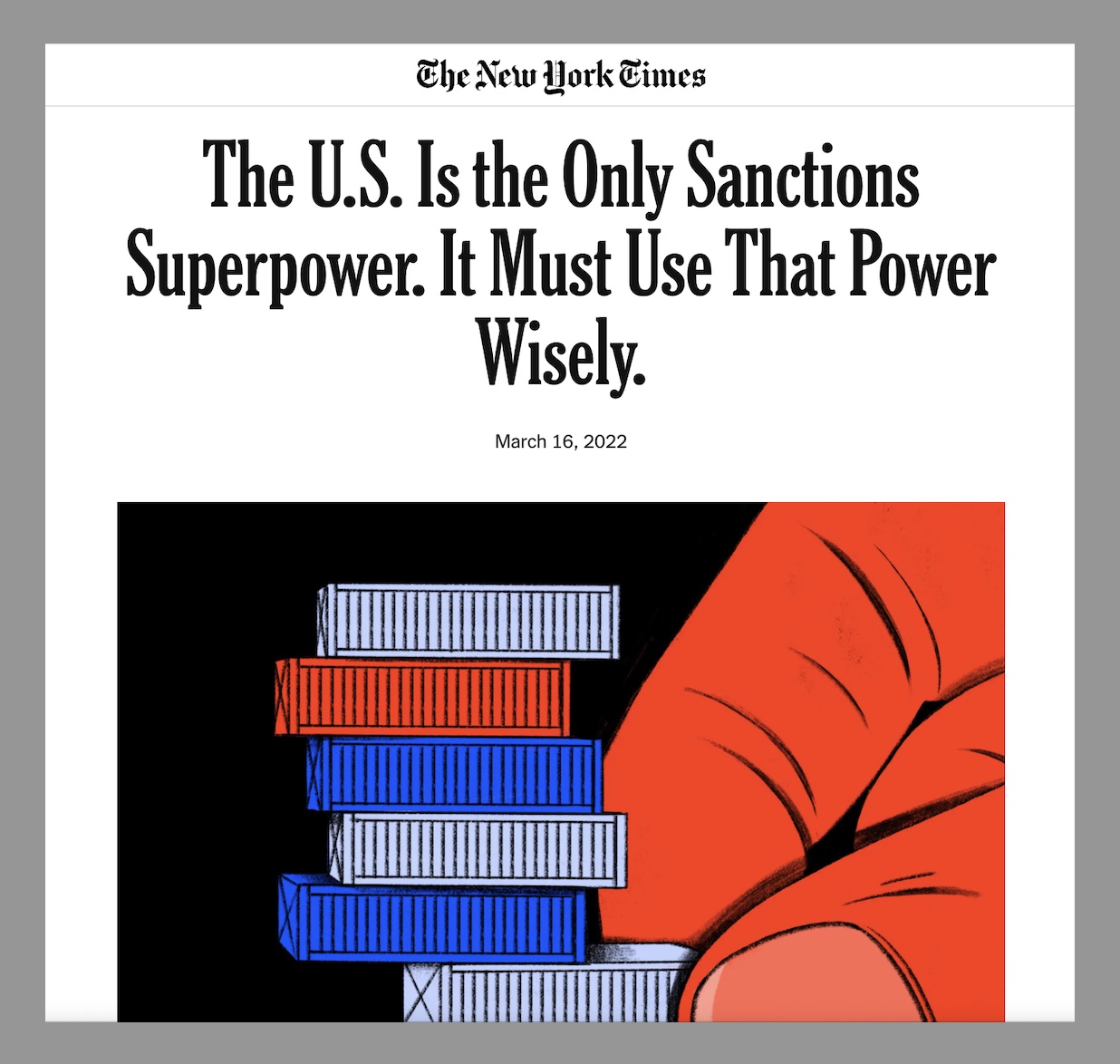 Re Another choice line: “Some media refer to the US as the world’s only ‘sanctions superpower.’” Correction, PD, an opinion piece in one US newspaper, the New York Times, made this reference. And Chinese state media and the foreign ministry have gotten great mileage out of it.