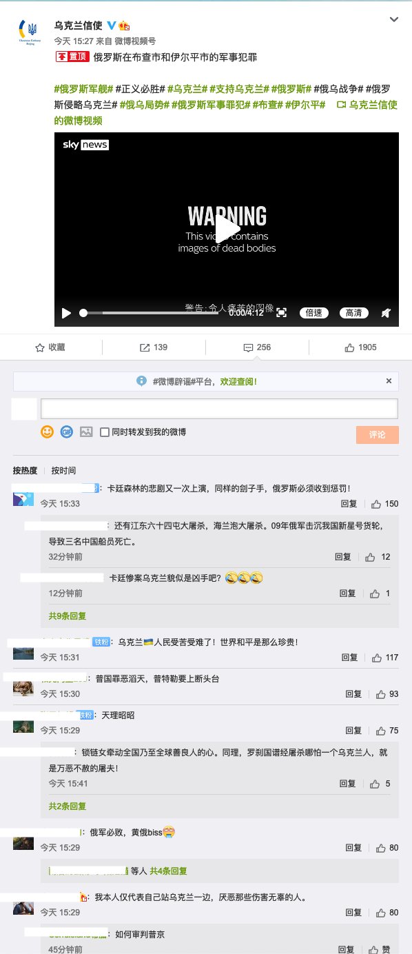 Ukranian Embassy to China posted #Buchamassacre video on Weibo less than two hours ago, reactions overwhelmingly positive, harsh pushbacks for trolls. Might become most often shared Weibo post on #Bucha today.