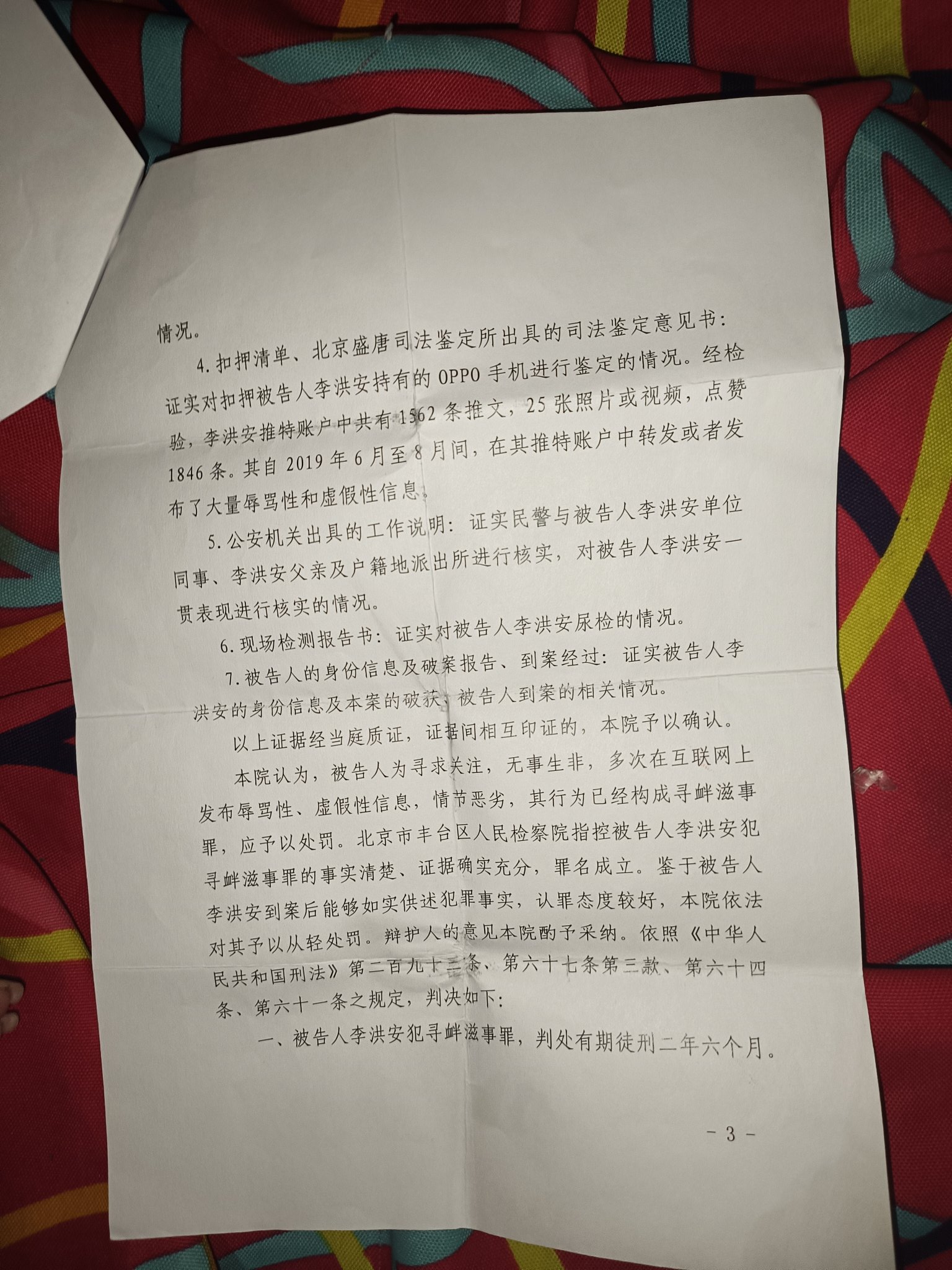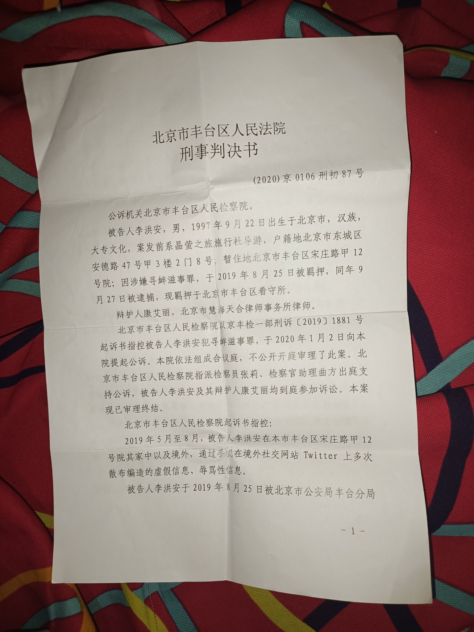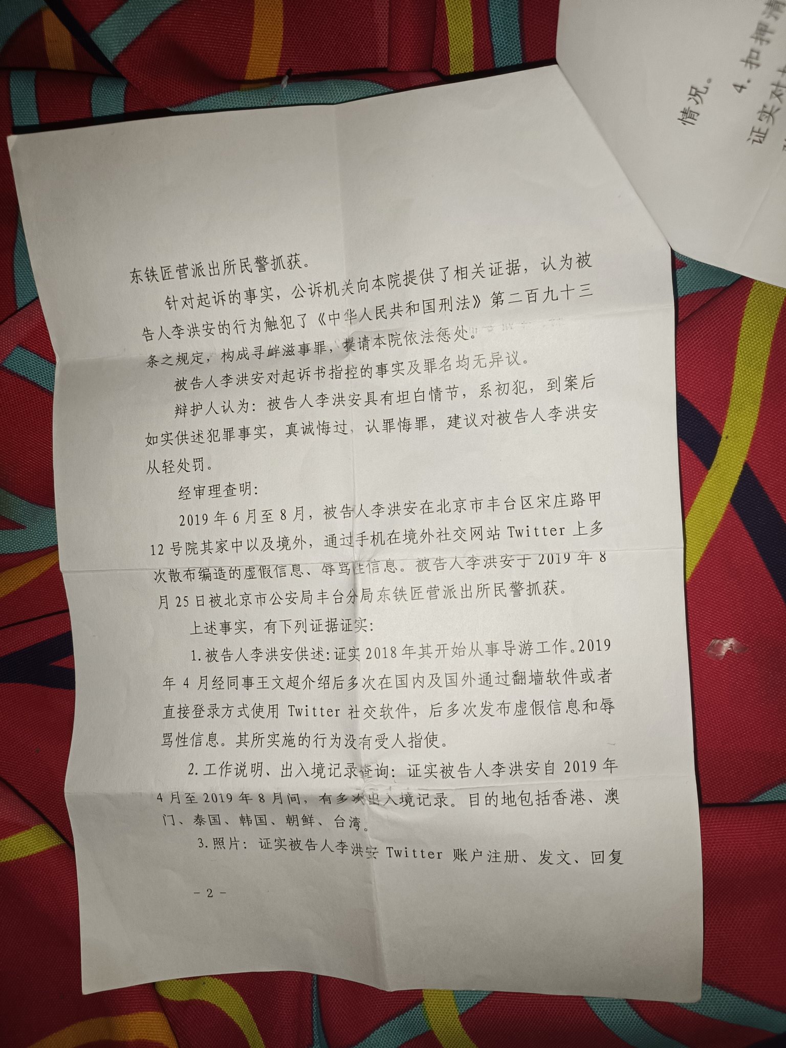 北京异议人士李红安(@LiHongAn922),因在推特发表了关于六四事件、香港民主运动和宣扬民主等言论(官方称虚假信息和辱骂性信息),被判处有期徒刑两年半,已于今年二月刑满释放。
