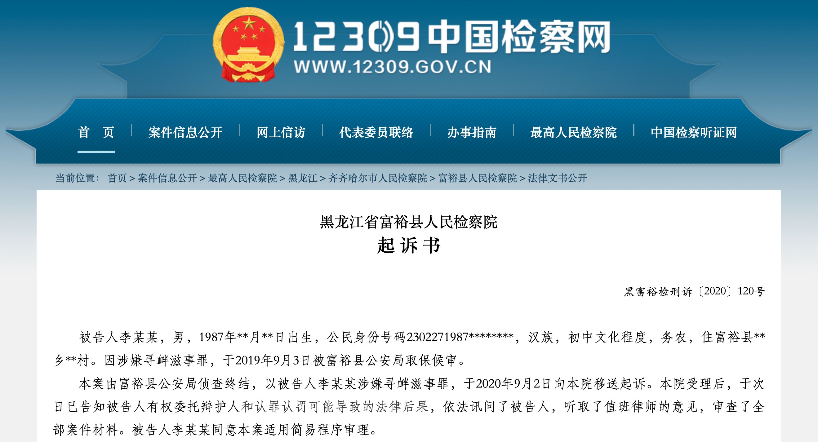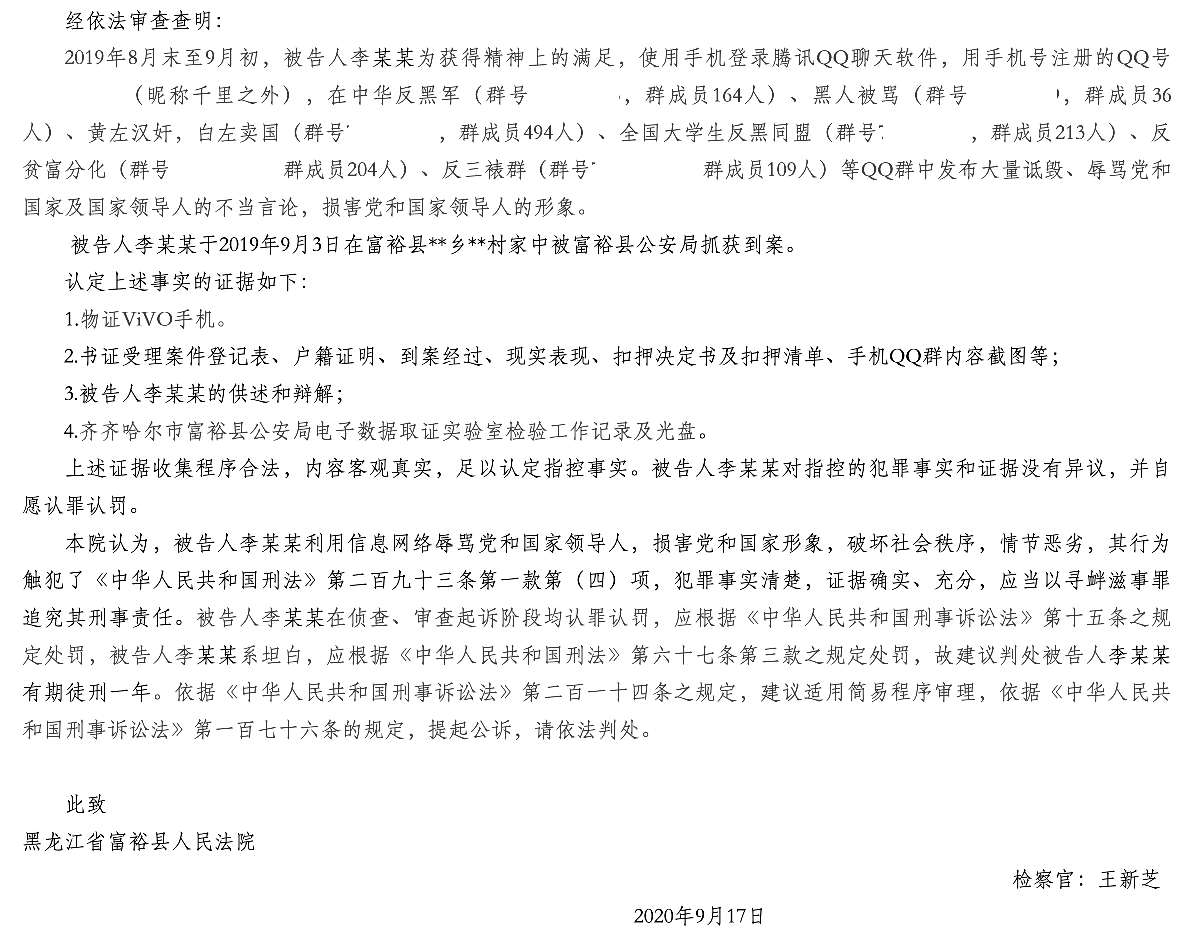 黑龙江富裕县男子李某,因在多个QQ群内“发布大量诋毁、辱骂党和国家及国家领导人的不当言论,损害党和国家领导人的形象”,于2019年被捕,并于次年9月被当地检方以寻衅滋事罪提起公诉,判决不详。
