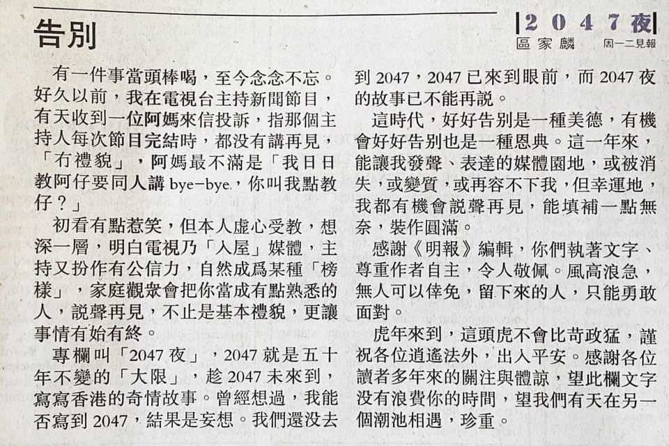 “I once wondered whether I could keep writing till 2047, but it’s a delusion in the end,” Au wrote in his last column at @mingpaocom.