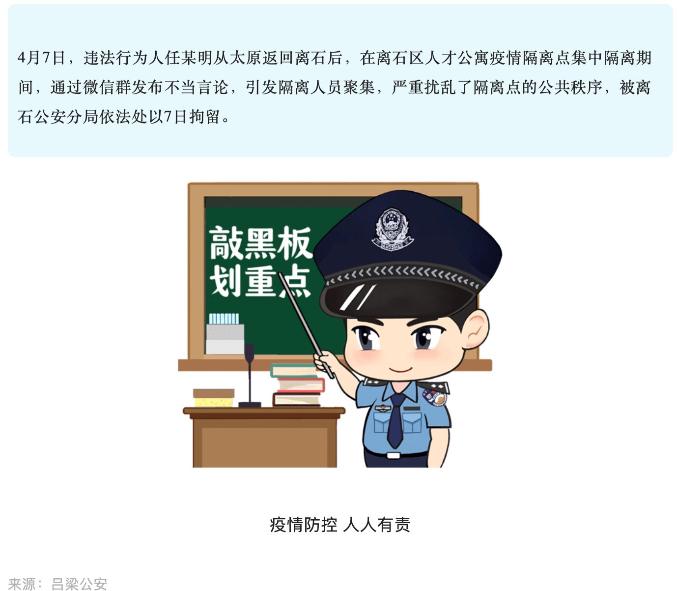 山西省吕梁市男子任某明,因在跨市旅行后隔离期间通过微信群发布“不当言论”,被处拘留7日。任某明的具体言论内容不详,但公安称其言论引发了隔离人员聚集,因此或与防疫政策有关。