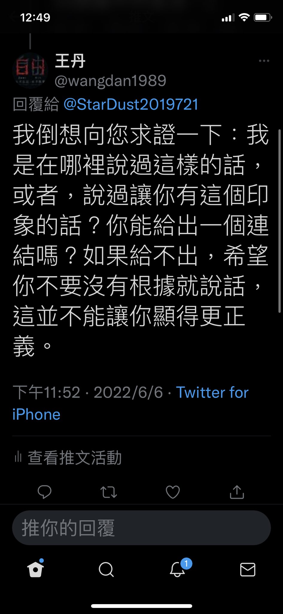 Re @StarDust2019721 我倒想向您求證一下:我是在哪裡說過這樣的話,或者,說過讓你有這個印象的話?你能給出一個連結嗎?如果給不出,希望你不要沒有根據就說話,這並不能讓你顯得更正義。