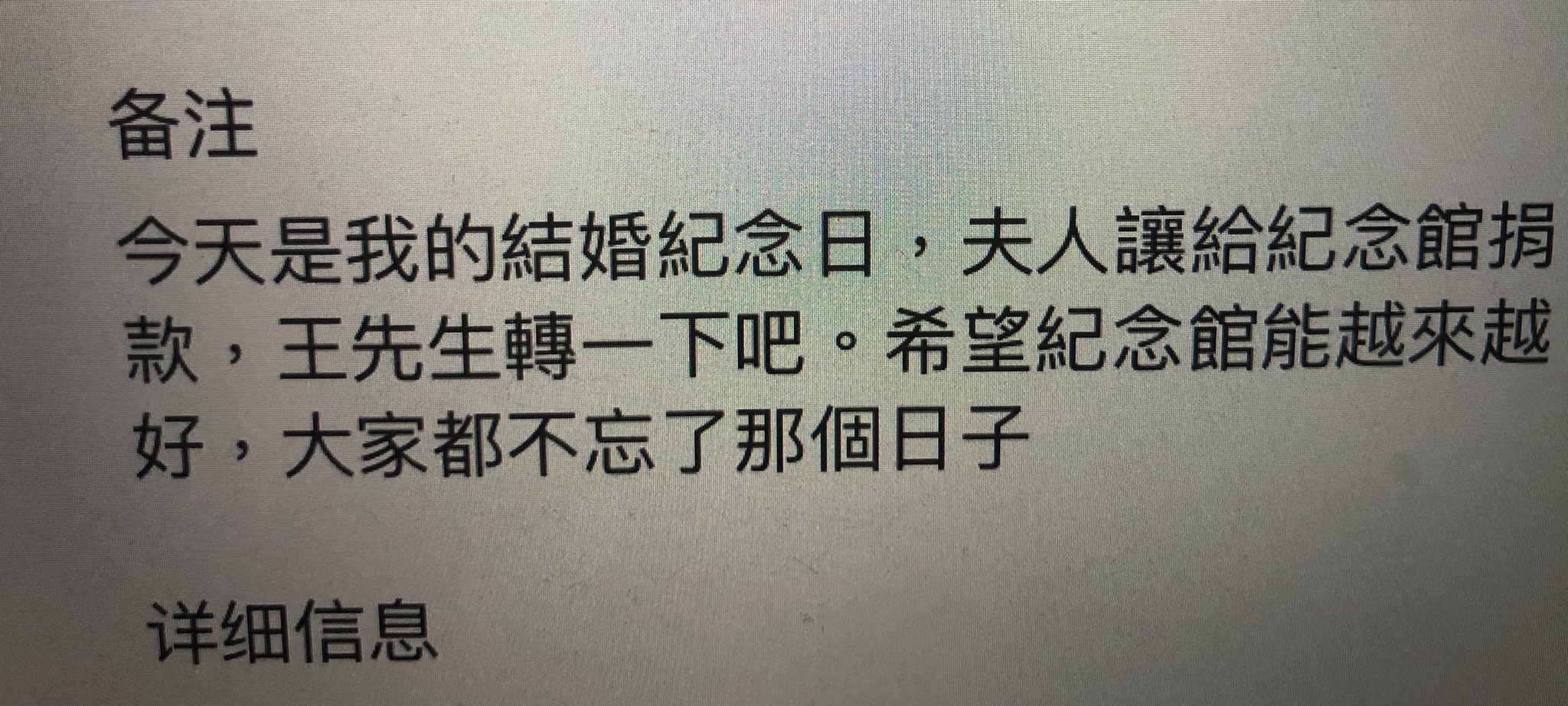 但在輾轉得知六四紀念館的事情後,託友人轉來100元人民幣捐款。