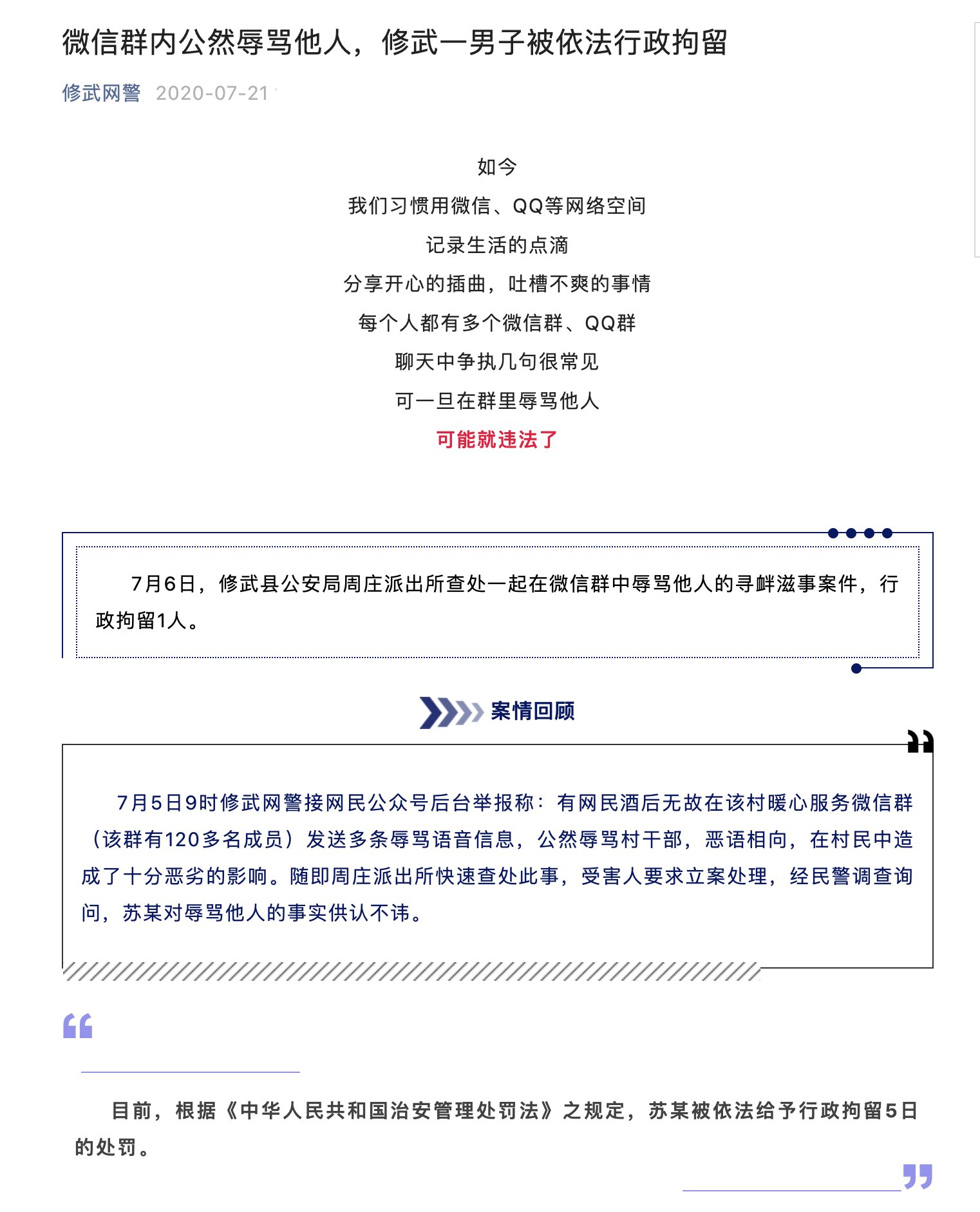 2020年7月,河南省修武县男子苏某,因在微信群“辱骂村干部”,被处拘留5日。