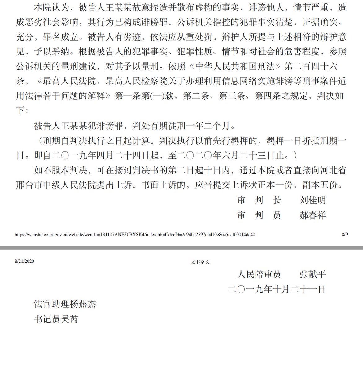 Hebei man Wang Guijun sentenced to 14 months in prison for accusing local village party secretary of corruption in the village council election and malfeasance on multiple websites. He pleaded not guilty in the court, saying his accusations were true.