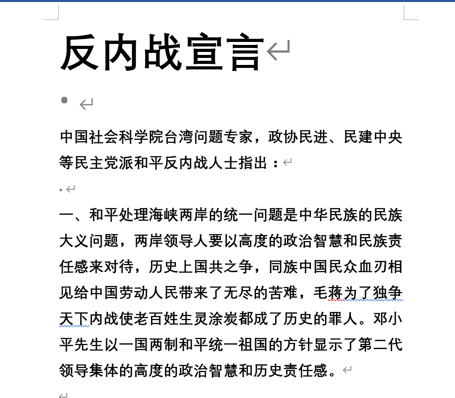 高瑜: 昨天牆內網絡出現這份《反內戰宣言》,開篇即指明“中國社會科學院台灣問題專家,政協民進,民建中央等民主黨派和平反內戰人士指出”,無個人署名,提及單位尚無表態。這篇宣言是用文件發出,沒有被封殺、屏蔽。