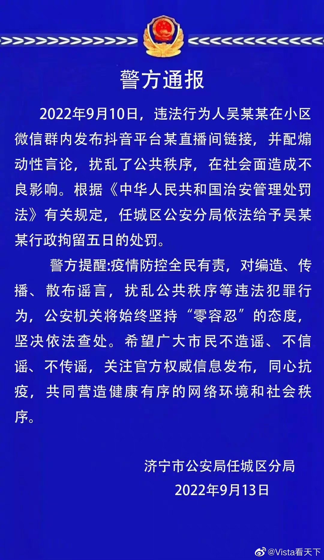 山东省济宁市男子吴某,因在小区业主群内号召业主们去抖音平台的央视直播间下求助(或因该地区被封控且物资供应不足),被处拘留5日。
