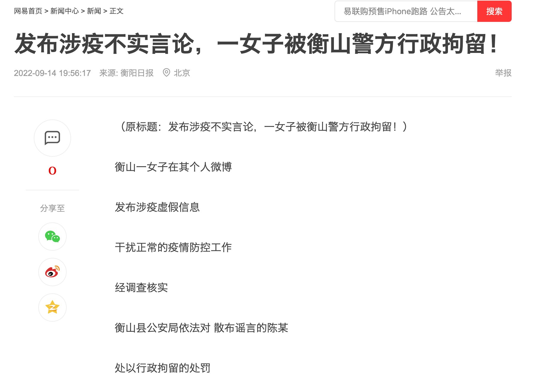 湖南省衡山县女子陈某,因在微博发言抱怨抗疫政策,被认定为发布“涉疫不实信息”并被拘留7日。其被认定为“不实”的言论内容包括“乱赋黄码、层层加码”“利用全民核酸检测掏空医保资金”等。