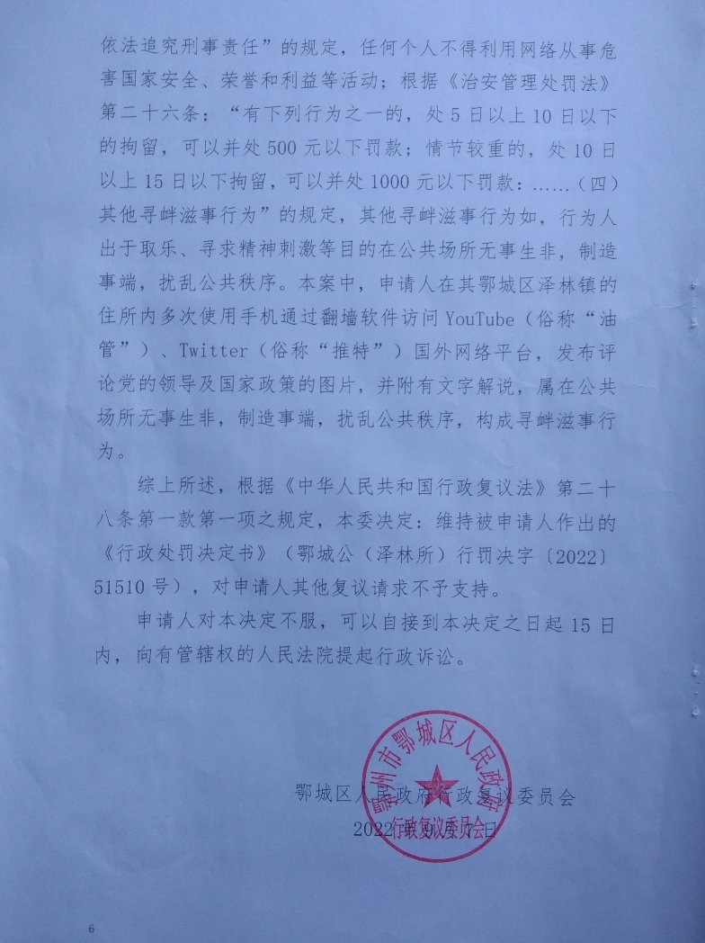 Re 异议人士余钱,就其因批评防疫政策及中共政权的言论被拘留一事申请了行政复议,但政府拒绝了其申请。