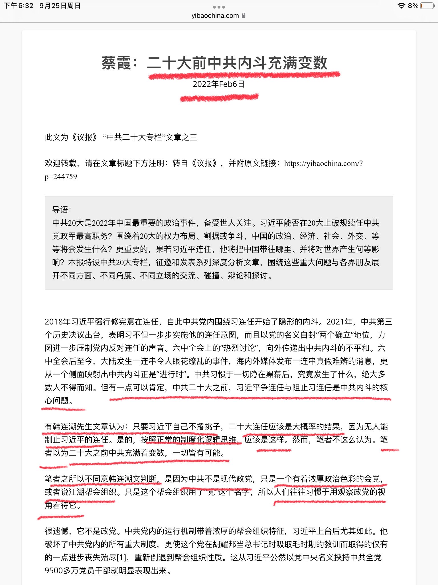 下面是我2月6日发布的文章《二十大前中共内斗充满变数》节选。