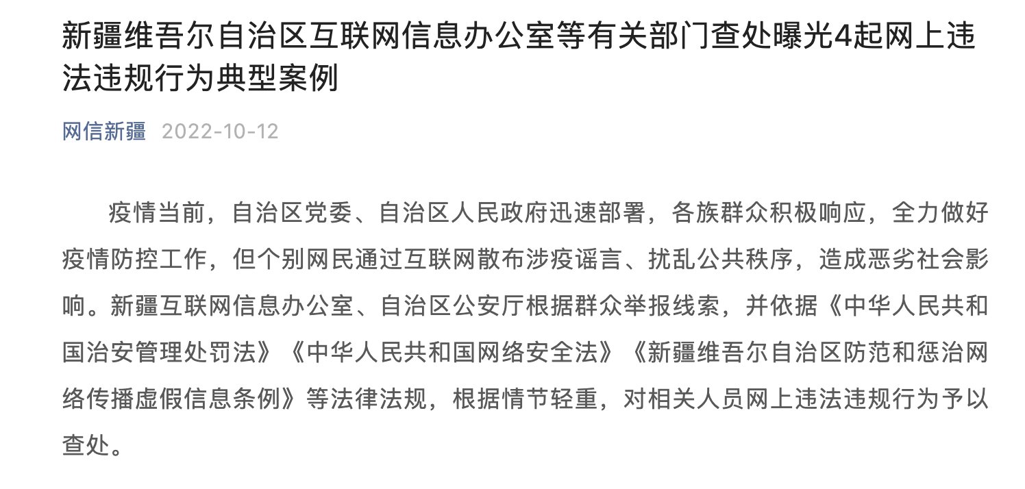 10月12日,新疆网信办又通报了4起涉及疫情的网络“违法违规行为”,又是4起因言获罪案。其中一起是一名阿瓦提的男子因在网上说当地要给动物做核酸而被警方批评教育。当地是否真的准备给动物做核酸我不清楚,但是这事在全国早已屡见不鲜了,并且这个说法显然远远达不到干扰防疫的程度,不构成违法。