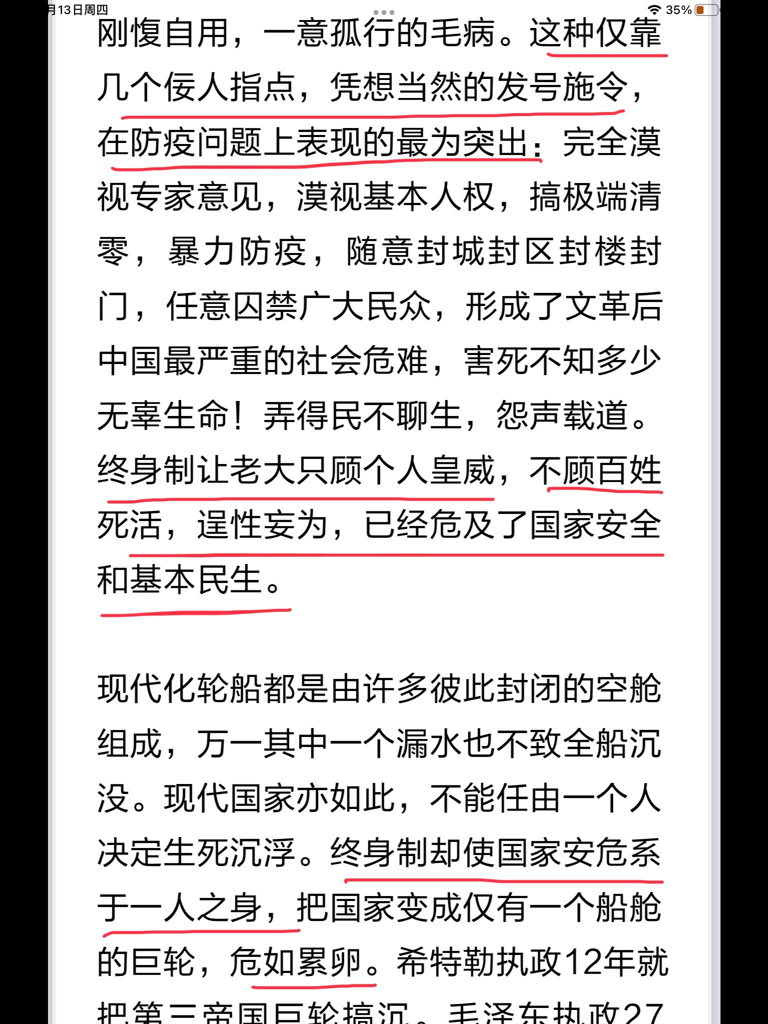 彭载舟先生提出的罢免独裁者国贼习近平的攻略中,专门全文推出了中国著名作家老鬼发表在议报的文章《终身制误国害民,危及国家安全》。下面就是这篇全文: