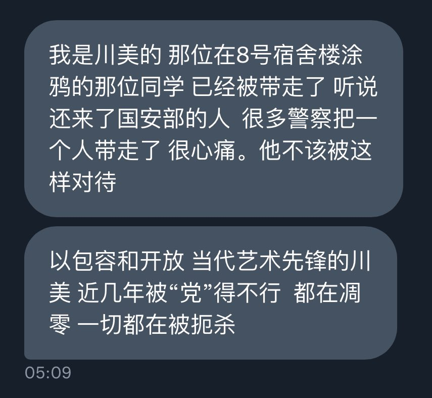 四川美术学院学生在校内墙壁涂鸦,内容如图,多为反对习近平和反对封控的言论,有消息称当事人已被警察带走。