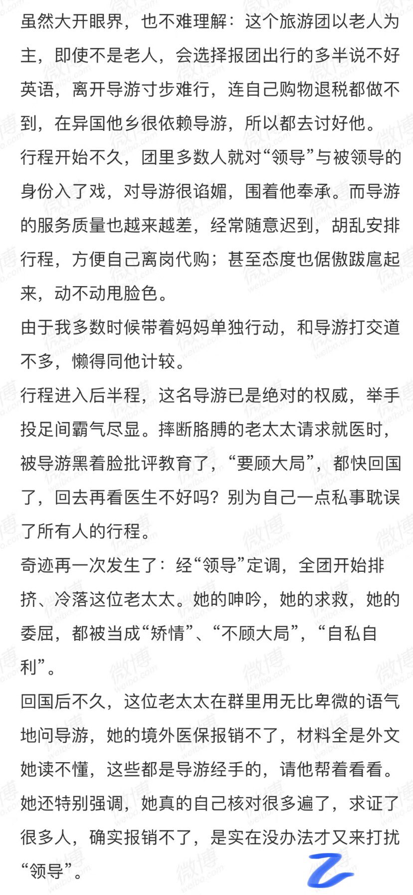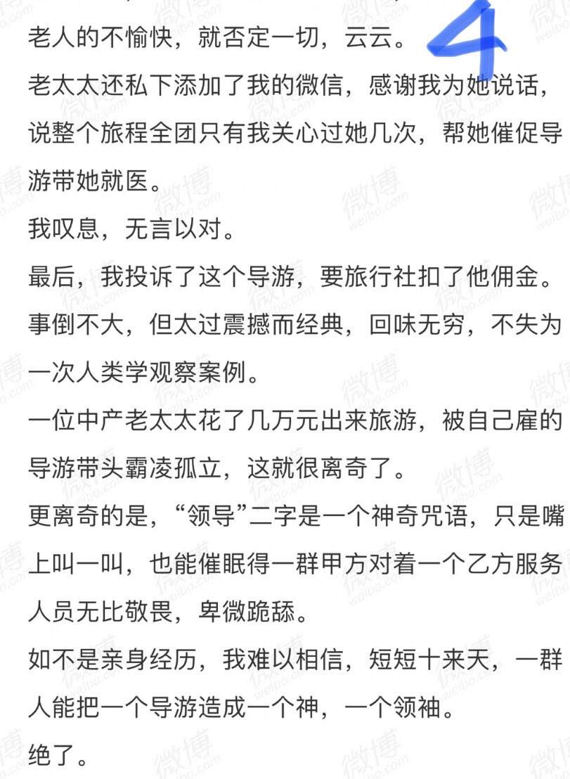 非常生动地透彻地写出了原本是服务者的导游如何将自己的语言优势变成权力资源,不仅在团体旅游中捞利,而且利诱胁迫游客,建立起只有依附于权力意志才能获利的人际关系,由此产生多数人被强权意志指挥与操控,对少数人(无错的人)的迫害。这篇短文太生动了。