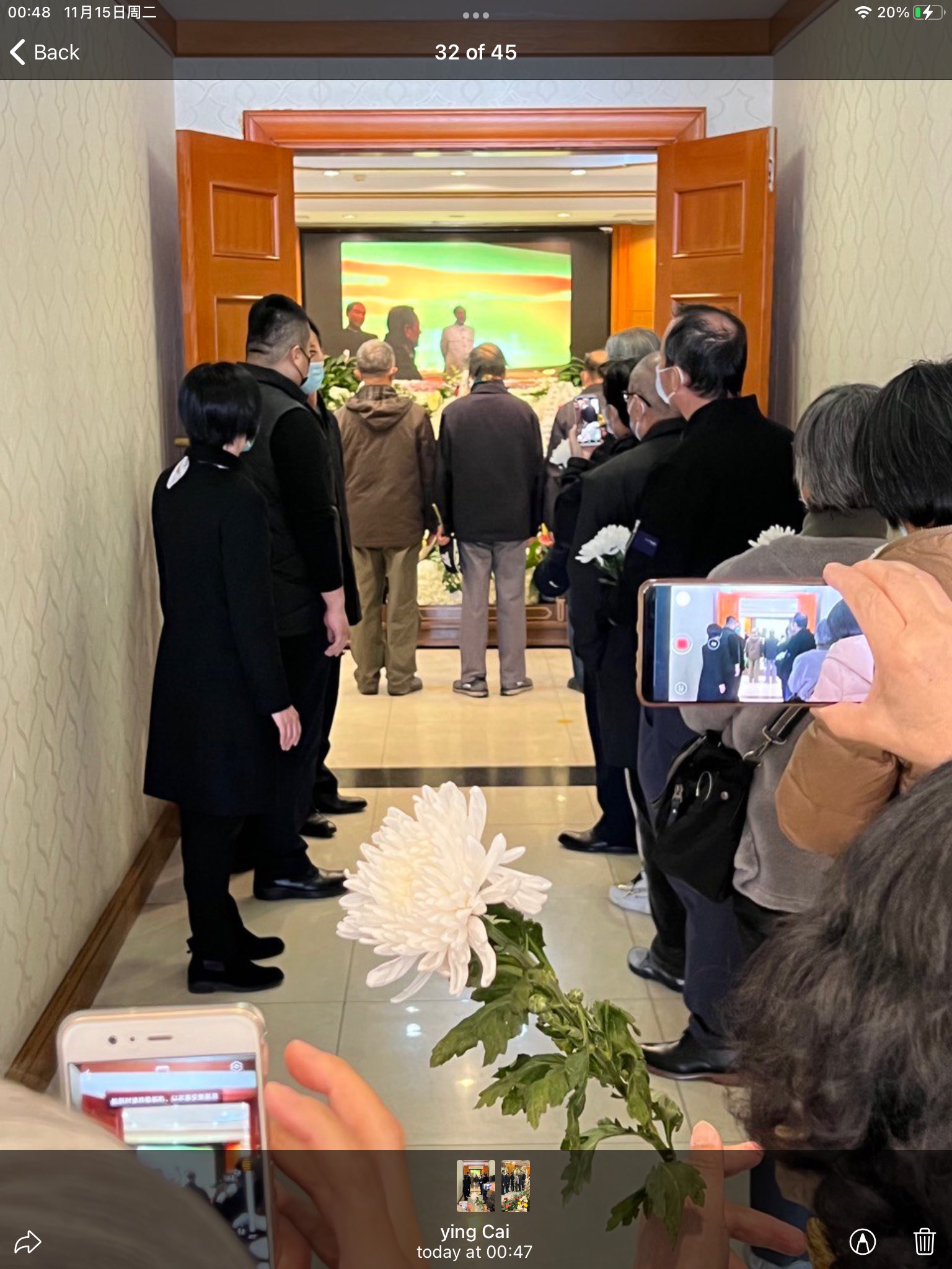 终于看到了在亲友晚辈送花圈挽联的署名中有我的名字,不能写“蔡霞”,写的是“彩霞”。在这段视频里一闪而过,在照片里,“彩霞”这个名字被遮挡了。鲍老千古!英灵不朽!