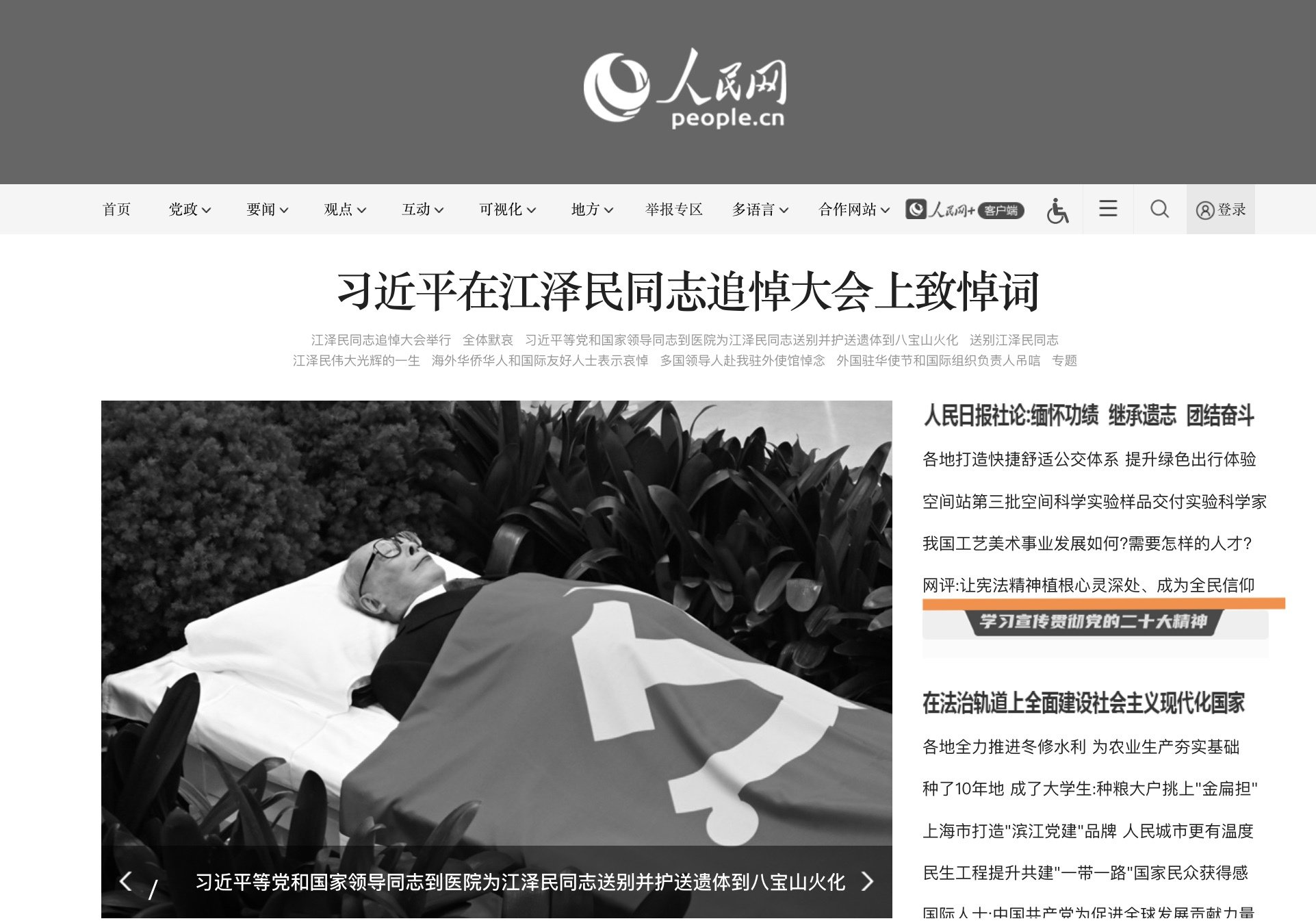 The homepage of People’s Daily Online today. Jiang Zemin is the focus, but Xi Jinping still leads — his words being the news.