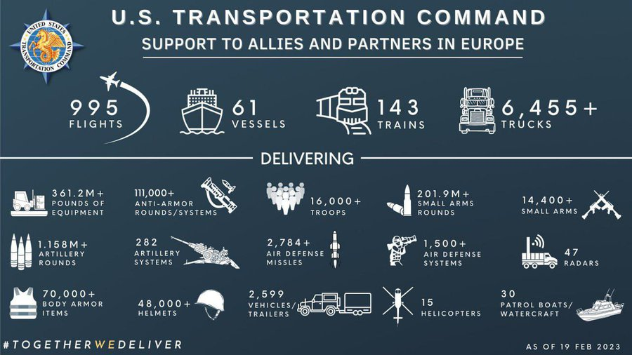 新台灣國防軍事網: 最新消息!:美軍運輸司令部發布消息,指出烏克蘭抗戰一年來美國共出動 995 架次飛機、61 艘次貨輪、143 列次貨運火車與超過 6455 車次的卡車,向烏克蘭運輸交付大量軍援物資