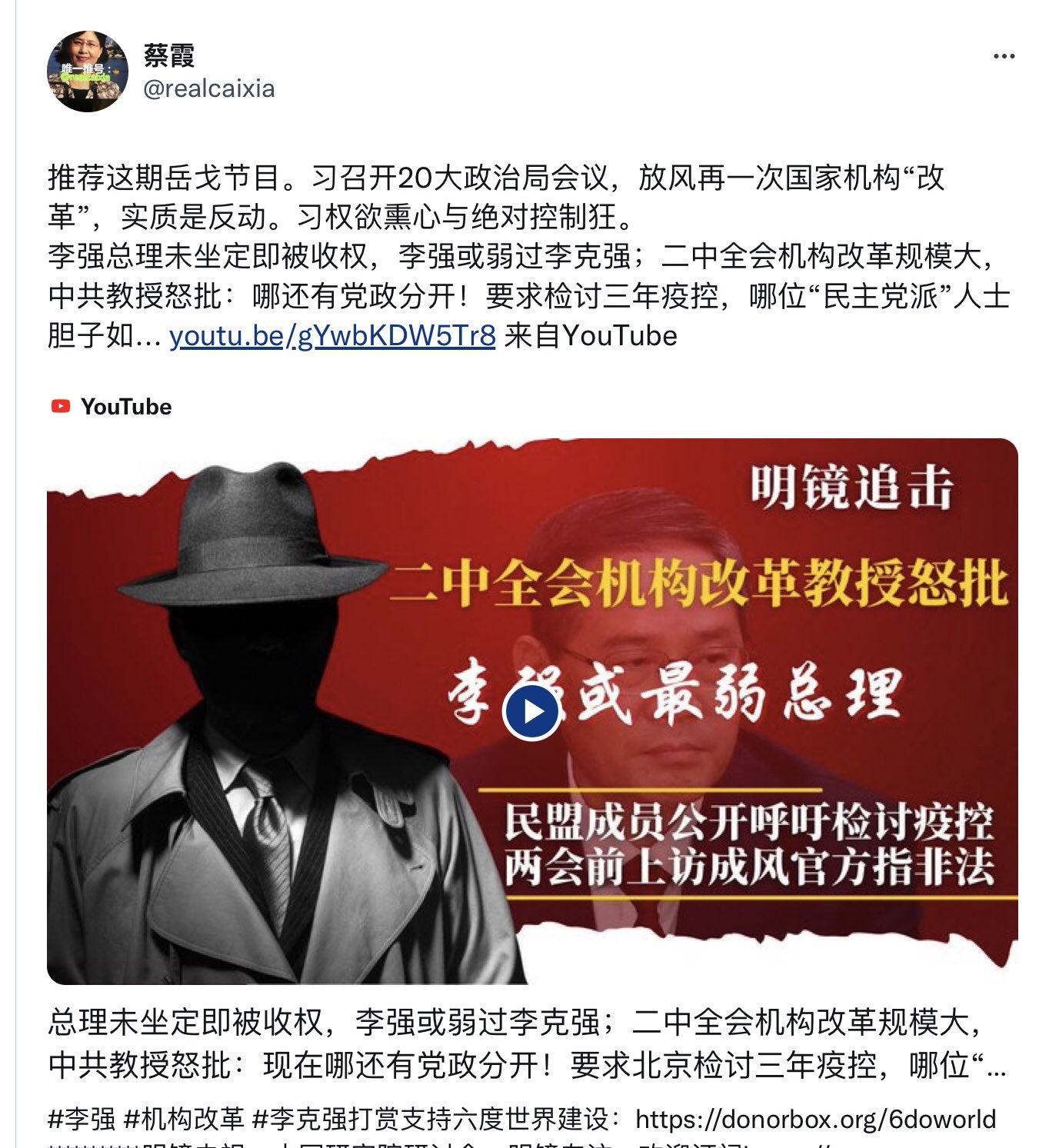 李强总理未坐定即被收权,李强或弱过李克强;二中全会机构改革规模大,中共教授怒批:哪还有党政分开!要求检讨三年疫控,哪位“民主党派”人士胆子如… https://youtu.be/gYwbKDW5Tr8