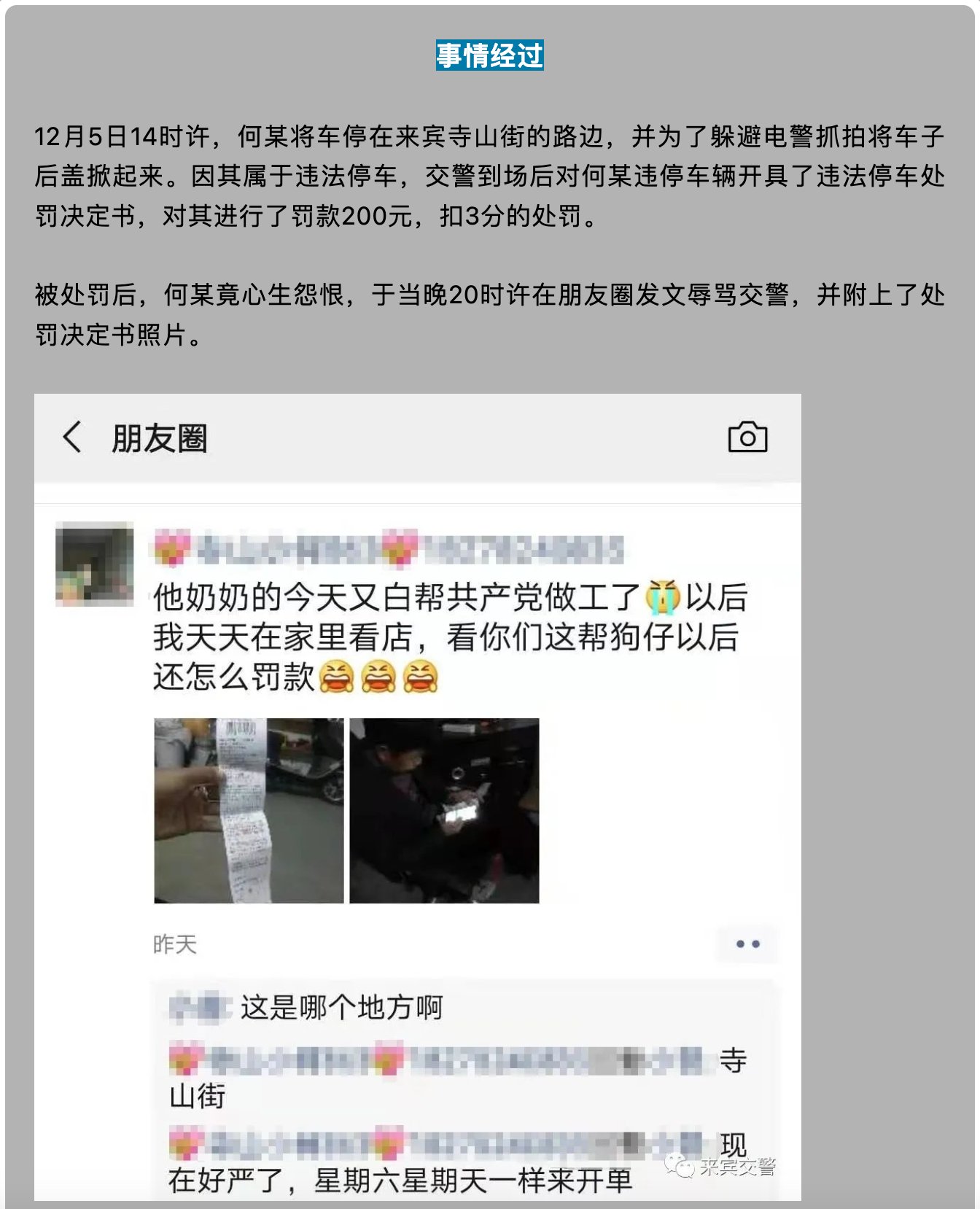 广西来宾市女子何某连,因在被交警处罚后在朋友圈发文抱怨,并称交警为“狗仔”,被认定为侮辱交警并被拘留3日。 https://t.co/E7XOpwTijC