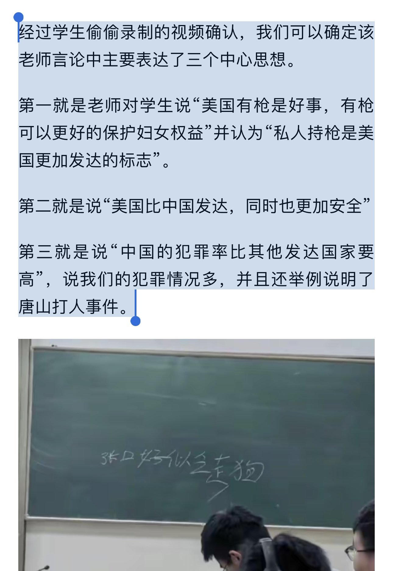 Re 南京航空航天大学某教师,因在课堂上发表了包括“美国持枪是好事”“美国比中国发达和安全”“西方在学术方面比中国发达”“多数科技产品都是欧美的”以及“如果中国实行经济封锁,一大半中国人都没有饭吃”等观点,被学生举报并遭到校方停职处理,目前正接受调查。 https://t.co/51s62YuANs