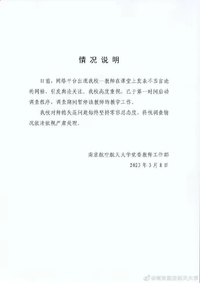 Re Teacher at Nanjing University of Aeronautics and Astronautics suspended & under investigation for his inappropriate remarks during a class, including “the west is safer and more academically and scientifically advanced than China and China’s economy largely relies on the west”. https://t.co/9xQyDIjr4G