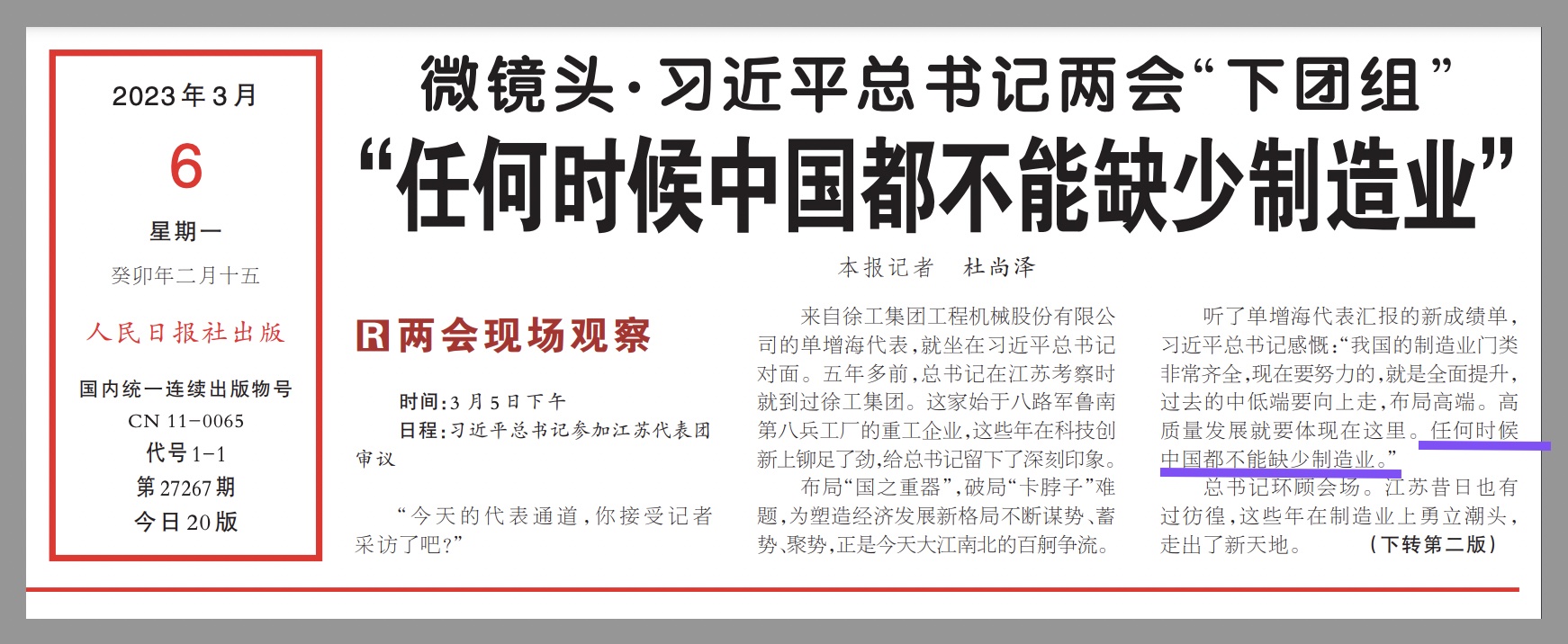 Re But one page-one phrase making the rounds today in the official media is the quote in this article from Xi affirming the importance of manufacturing: “At no time can China be without manufacturing” (任何时候中国都不能缺少制造业). https://t.co/jdvllRuJ7V