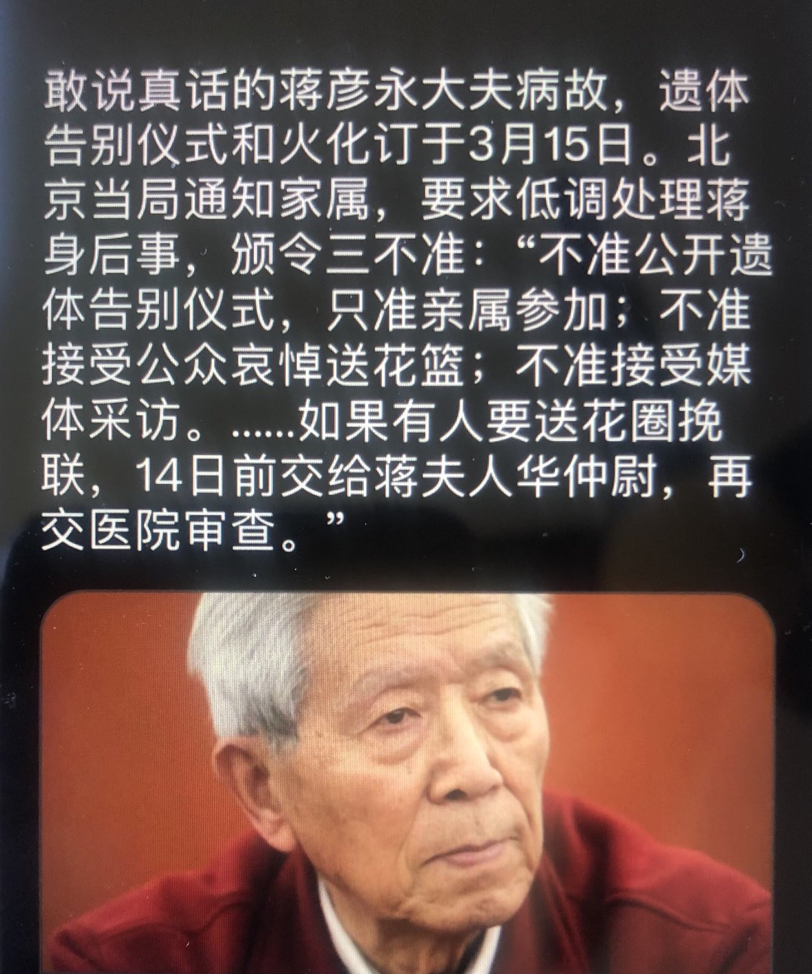 蒋彦永医生是唯一能把2003年非典、新冠疫情、六四事件三件重要历史凝结在一起的全球关注焦点人物。他的超小型告别仪式正在戒备森严下举办。很多亲人、战友、同事都未被允许参加。自从2019年他被关起来后到现在,基本完全噤声,亲友全被威胁和限制。 https://t.co/aJjn9Gk1Tp</div>