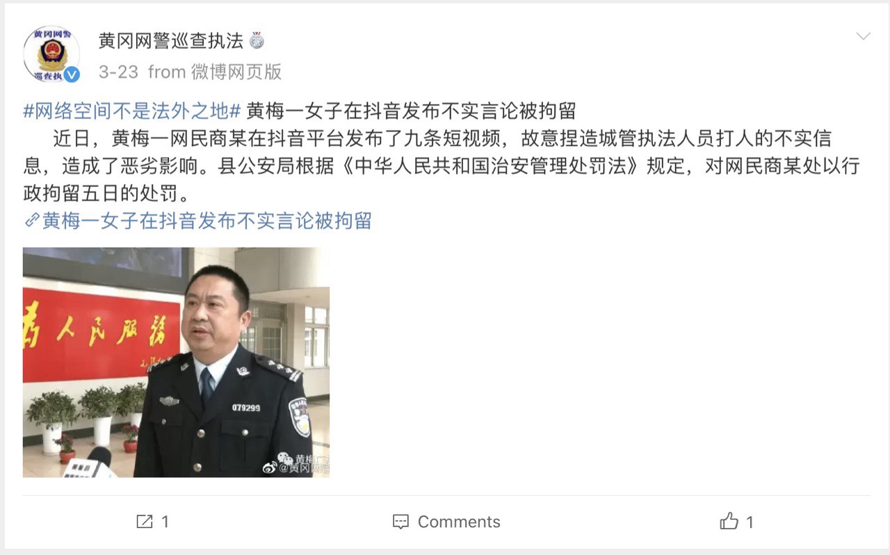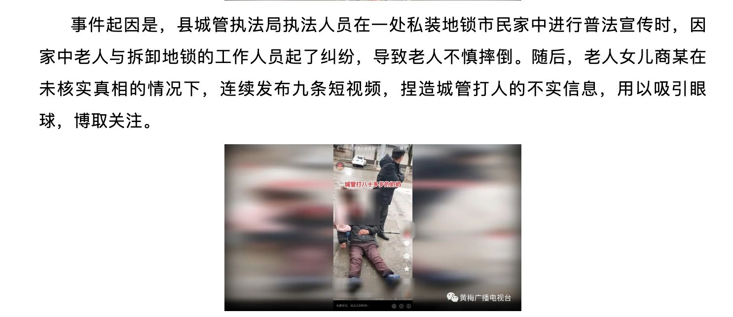 湖北省黄梅县女子商某,因在抖音发布视频曝光城管打人,被认定为发布虚假信息并被拘留5日。警方的解释是城管在执法过程中不慎导致老人摔倒。 https://t.co/r1wyjmyfcP
